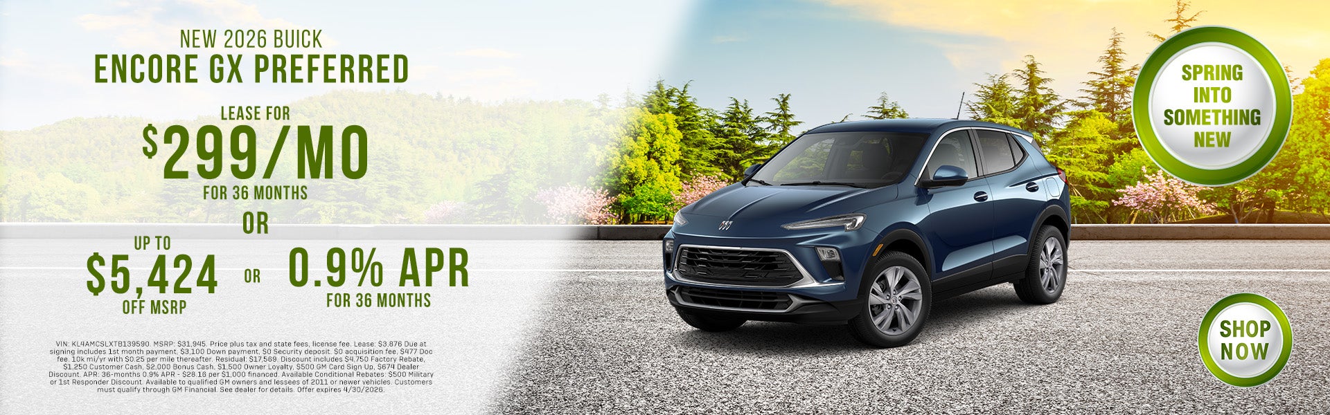 VIN: KL4AMCSLXTB139590. MSRP: $31,945. Price plus tax and state fees, license fee. Lease: $3,876 Due at signing includes 1st month payment, $3,100 Down payment, $0 Security deposit. $0 acquisition fee, $477 Doc fee. 10k mi/yr with $0.25 per mile thereafter. Residual: $17,569. Discount includes $4,750 Factory Rebate, $1,250 Customer Cash, $2,000 Bonus Cash, $1,500 Owner Loyalty, $500 GM Card Sign Up, $674 Dealer Discount. APR: 36-months 0.9% APR - $28.16 per $1,000 financed. Available Conditional Rebates: $500 Military or 1st Responder Discount. Available to qualified GM owners and lessees of 2011 or newer vehicles. Customers must qualify through GM Financial. See dealer for details. Offer expires 4/30/2026.