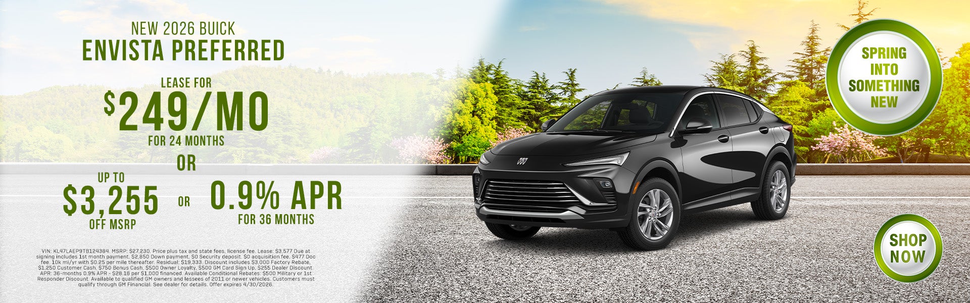 VIN: KL47LAEP9TB124384. MSRP: $27,230. Price plus tax and state fees, license fee. Lease: $3,577 Due at signing includes 1st month payment, $2,850 Down payment, $0 Security deposit. $0 acquisition fee, $477 Doc fee. 10k mi/yr with $0.25 per mile thereafter. Residual: $19,333. Discount includes $3,000 Factory Rebate, $1,250 Customer Cash, $750 Bonus Cash, $500 Owner Loyalty, $500 GM Card Sign Up, $255 Dealer Discount. APR: 36-months 0.9% APR - $28.16 per $1,000 financed. Available Conditional Rebates: $500 Military or 1st Responder Discount. Available to qualified GM owners and lessees of 2011 or newer vehicles. Customers must qualify through GM Financial. See dealer for details. Offer expires 4/30/2026.