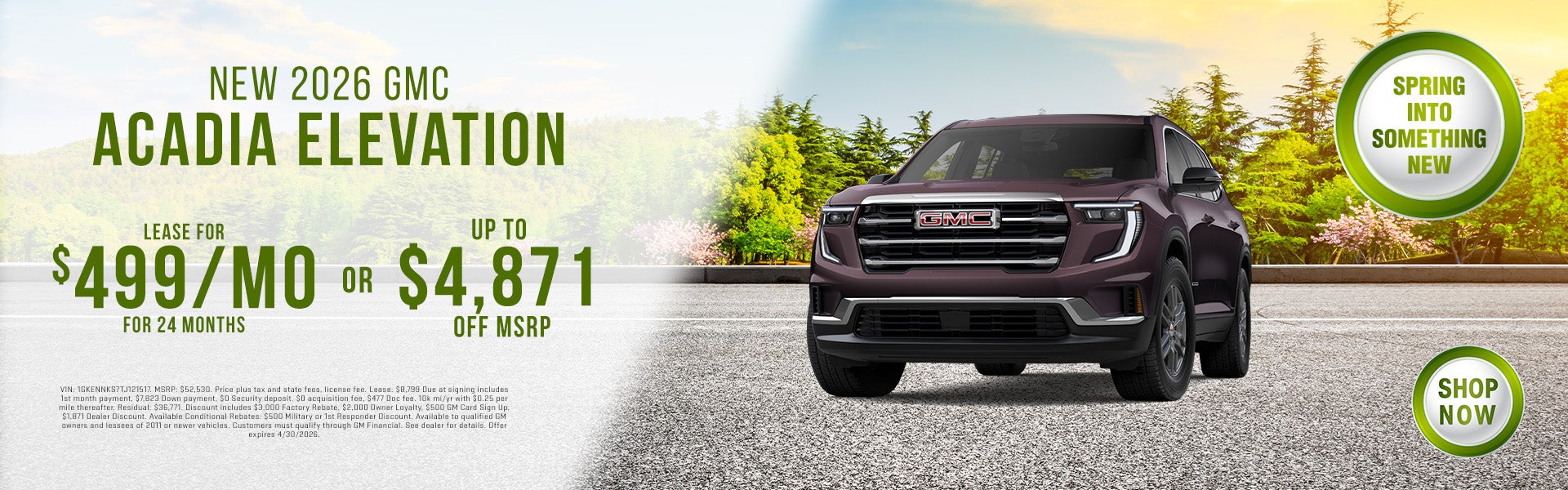 VIN: 1GKENNKS7TJ121517. MSRP: $52,530. Price plus tax and state fees, license fee. Lease: $8,799 Due at signing includes 1st month payment, $7,823 Down payment, $0 Security deposit. $0 acquisition fee, $477 Doc fee. 10k mi/yr with $0.25 per mile thereafter. Residual: $36,771. Discount includes $3,000 Factory Rebate, $2,000 Owner Loyalty, $500 GM Card Sign Up, $1,871 Dealer Discount. Available Conditional Rebates: $500 Military or 1st Responder Discount. Available to qualified GM owners and lessees of 2011 or newer vehicles. Customers must qualify through GM Financial. See dealer for details. Offer expires 4/30/2026.