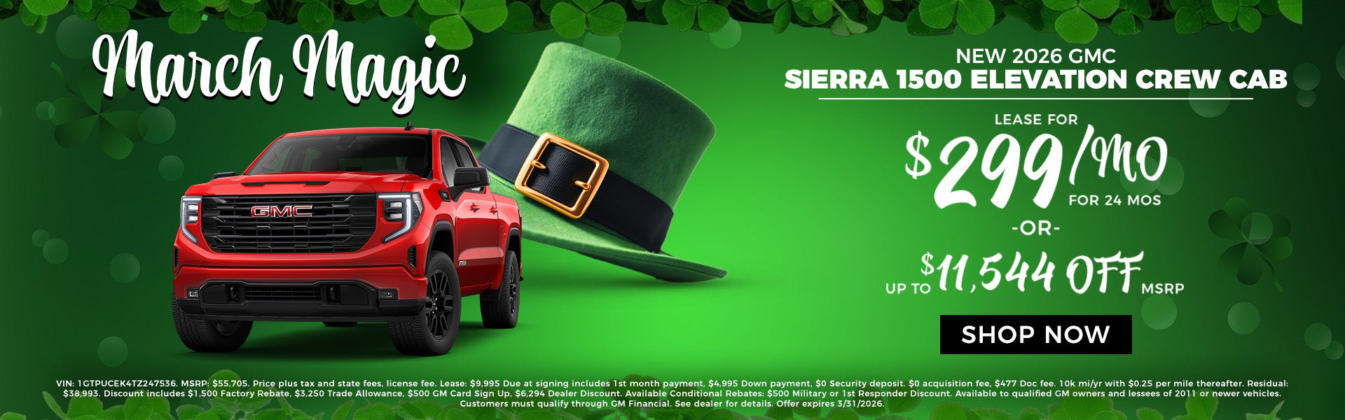 VIN: 1GTPUCEK4TZ247536. MSRP: $55,705. Price plus tax and state fees, license fee. Lease: $9,995 Due at signing includes 1st month payment, $4,995 Down payment, $0 Security deposit. $0 acquisition fee, $477 Doc fee. 10k mi/yr with $0.25 per mile thereafter. Residual: $38,993. Discount includes $1,500 Factory Rebate, $3,250 Trade Allowance, $500 GM Card Sign Up, $6,294 Dealer Discount. Available Conditional Rebates: $500 Military or 1st Responder Discount. Available to qualified GM owners and lessees of 2011 or newer vehicles. Customers must qualify through GM Financial. See dealer for details. Offer expires 3/31/2026.